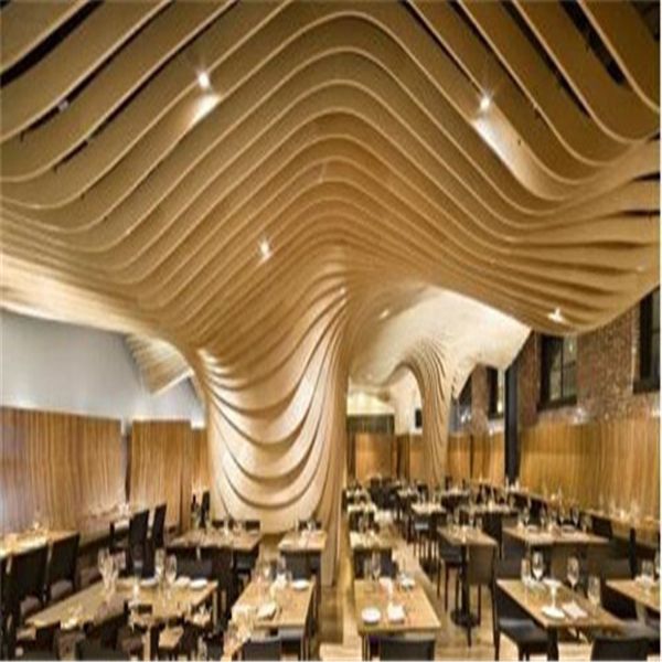 江西金騰達弧形/波浪形造型鋁方通吊頂,這兒要說的是一種底面弧和周圍面弧結合的一種波浪造型鋁方通吊頂,底面弧度,首要跟著周圍面的線條走向,而周圍面弧,