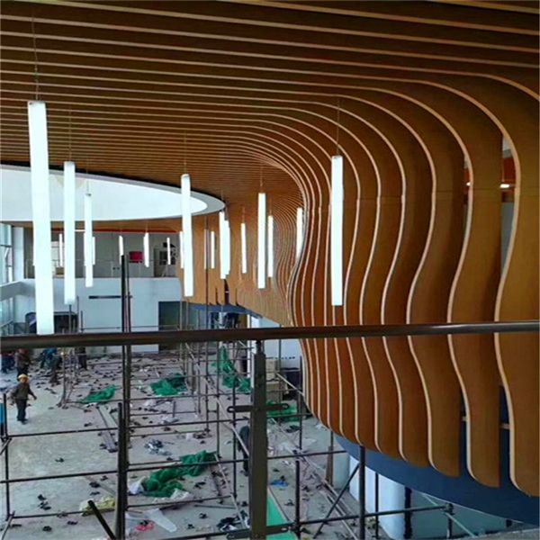 再用拉彎機進行拉彎處理,拉出各種弧度的弧形鋁方通。通過各種弧度的弧形鋁方通構(gòu)造出不同造型的波浪型吊頂,或者其他形狀的吊頂方式。